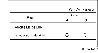 2. En fonction du niveau de liquide de frein, inspecter la continuité entre les bornes du capteur de niveau de liquide de frein.