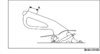 3. Contrôler la course du frein de stationnement en exerçant une traction lente, au niveau du point A, de 50 mm {1,97 in} à partir de l'extrémité du levier de frein de stationnement, avec une force de 98 N {10 kgf, 22 lbf}, et compter le nombre d'encoches (bruit de déclic).
