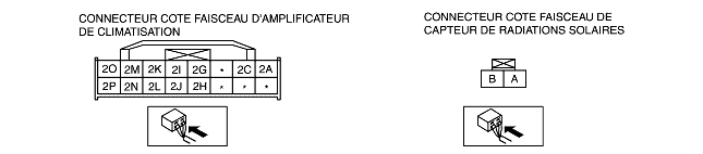 • Y a-t-il continuité entre les bornes suivantes du connecteur d'amplificateur de climatisation (16 broches) et du connecteur de capteur de rayonnement solaire ?
