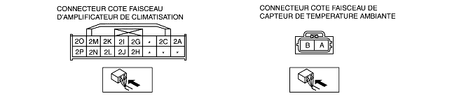 • Y a-t-il un court-circuit à la masse dans le faisceau de câblage entre la borne 2K du connecteur d'amplificateur de climatisation (16 broches) et la borne B du connecteur de capteur de température ambiante ?