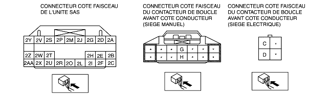 • Inspecter le faisceau de câblage entre la borne H (siège manuel) ou la borne C (siège électrique) du contacteur de boucle avant côté conducteur et la masse, concernant les éléments suivants :