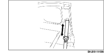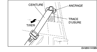 1. Si le véhicule a été sujet à un choc ou un accident, tirer la ceinture du rétracteur et confirmer qu'il n'y a aucune trace d'usure (le limiteur de charge n'a pas fonctionné) en inspectant visuellement la ceinture et en la touchant.