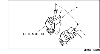 4. S'assurer que la ceinture de sécurité ne se verrouille pas lorsque l'enrouleur est incliné lentement à 15° maximum à partir de la position de fixation, et qu'elle se verrouille lorsque le rétracteur est incliné à 40° ou plus.