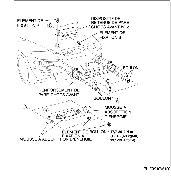 5. Déposer les éléments de fixation B, puis déposer l'élément de retenue de pare-chocs avant N° 2.