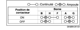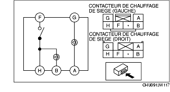 2. Contrôler que la continuité entre les bornes du contacteur de chauffage de siège correspond aux valeurs indiquées dans le tableau.
