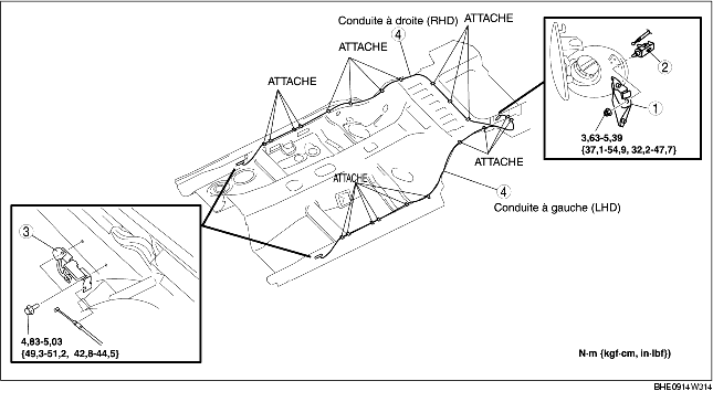 (3) Déposer les éléments de fixation et les attaches du faisceau de câblage, puis décoller partiellement le revêtement de plancher de sorte que le levier d'ouverture de la trappe de remplissage de carburant puisse être déposé.