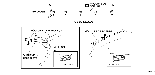 2. Tout en tirant la moulure de toit vers le haut, la séparer des attaches des sections B, puis retirer la moulure de toit.