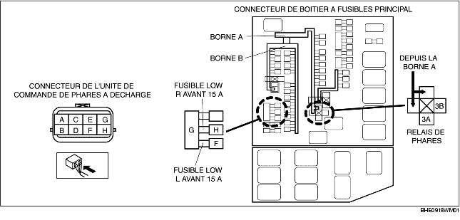 INSPECTER LE CIRCUIT D'ALIMENTATION DE L'UNITE DE COMMANDE DES PHARES A DECHARGE