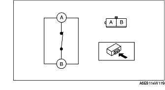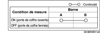 3. Vérifier que la continuité entre les bornes du contacteur d'éclairage de compartiment de coffre correspond aux valeurs indiquées dans le tableau.