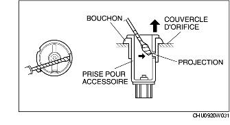 1. En appuyant la tête plate d'un tournevis entourée d'une bande protectrice adhésive contre la projection du capuchon, dégager la prise pour accessoires.