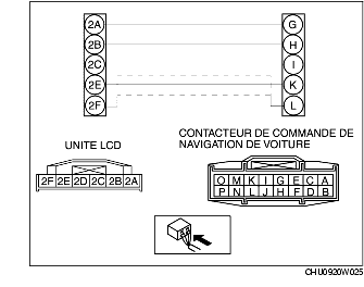 2. Rechercher la présence de circuit ouvert, court-circuit à l'alimentation ou de court-circuit à la masse au niveau du faisceau de câblage entre l'unité LCD et l'unité de commande de navigation du véhicule.