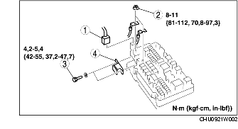 1. Presser les languettes dans le sens indiqué par les flèches, soulever le boîtier de fusible principal, puis déposer le boulon.